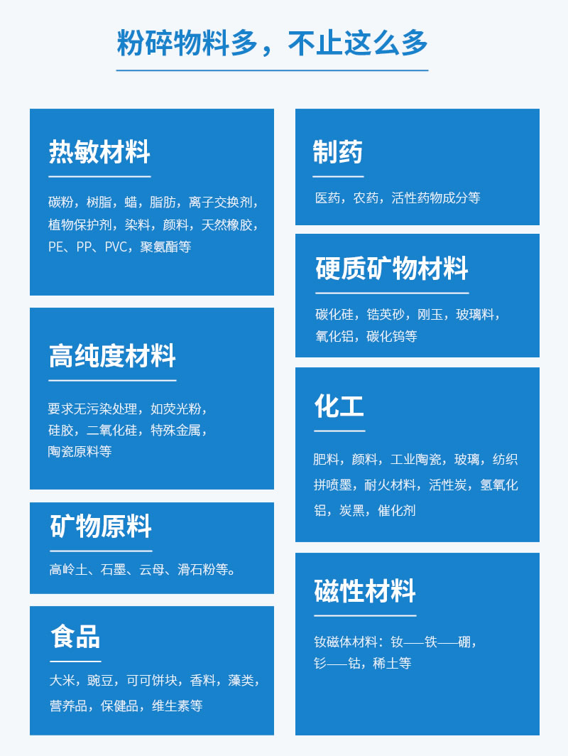 应用: 非金属矿、电池材料、精细化工、医药食品、颜料油漆,粉末冶金等超细粉体行业。